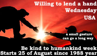 В 1988 году в США возник ежегодный всемирный праздник доброты - неделя "Будьте добры к человечеству". Празднование этой недели начинается с 25 Августа каждого года. А среда этой недели отмечается как среда "Готов протянуть руку помощи". На сегодняшнюю среду 27 Августа 2025г. как раз и выпадает этот праздник - среда "Готов протянуть руку помощи!". В этот не день не обязательно совершать что-то грандиозное, небольшой жест! - может вывести на длинный путь, и иметь большое значение. Например сегодня вы можете: помыть посуду или приготовить ужин, вместо того, кто делает это постоянно, а можете постирать или погладить или сложить чьи-нибудь вещи, можете просто проявить участие выслушав заботы другого человека и может быть помочь ему советом. А может хотя бы просто попытаться узнать: есть ли рядом с вами тот кому нужна эта самая "рука помощи"? А если вдруг окажется, что рядом с вами, в вашем окружении нет нуждающихся в "руке помощи" загляните вот на этот сайт - https://monkey.ucoz.net